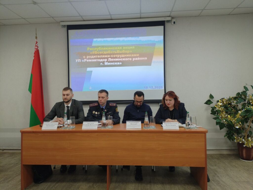 18.12.2025 Состоялось собрание коллектива предприятия, посвященное Республиканской акции “#ВсегдаЕстьВыбор”. Цель акции – информирование семей с детьми об ответственности за незаконный оборот наркотиков и выявление признаков участия в нем обучающихся и студентов.
